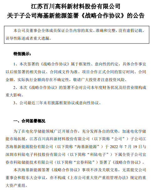 為在電化學(xué)儲(chǔ)能領(lǐng)域廣泛開展合作,充分發(fā)揮各自的優(yōu)勢,加速電化學(xué)儲(chǔ)能市場拓展, 7月19日,深圳市科陸電子科技股份有限公司下屬全資子公司宜春市科陸儲(chǔ)能技術(shù)有限公司與江蘇海基新能源股份有限公司達(dá)成合作共識(shí)并簽署了戰(zhàn)略合作協(xié)議。