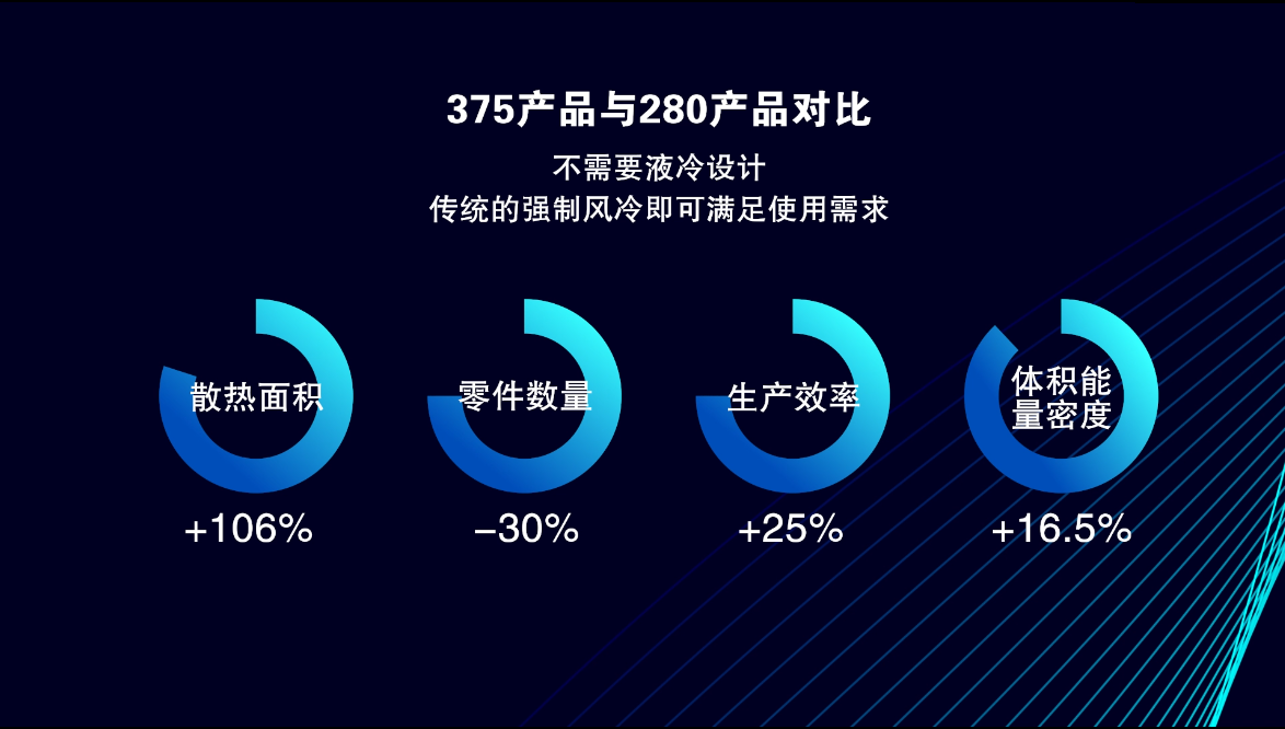 相比現(xiàn)有的280Ah產(chǎn)品,375Ah產(chǎn)品散熱面積提升了106%,無需液冷設計,傳統(tǒng)的強制風冷即可滿足使用需求;